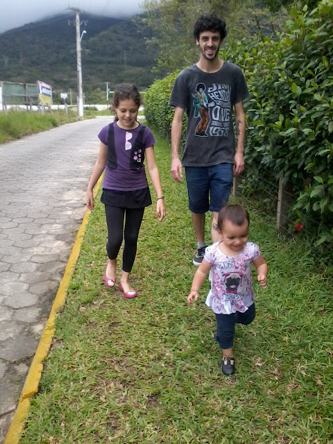 Ontem (feriado da Independência) pudemos ficar grudadinhas o dia todo. E precisou, viu? Ela comeu pouco, dormiu razoavelmente (no colo), rolou até uma febrezinha de leve, babou litros, e o humor... bom, o humor é o que mais muda, no caso dela. Fica bem chorosinha, quer mais colinho, mais peito, mais aconchego... Nesses dias eu entro no modo "fazer o mínimo de tarefas para ficar com ela ao máximo". E ainda bem que meu pai estava nos visitando e me ajuda um monte.Apesar disso, ela é bem guerreira, não se deixa abater. Fomos à pracinha com o abuelo, e correu, correu e correu, fugindo de mim. Rindo que se acabava. Brincou com areia. Subiu nos brinquedos. Catou pedrinhas. Enfim.